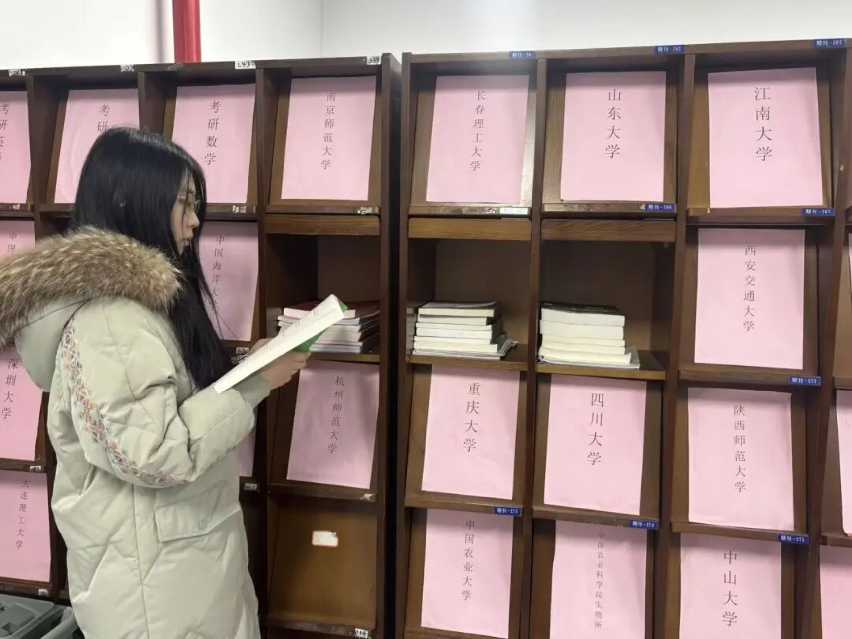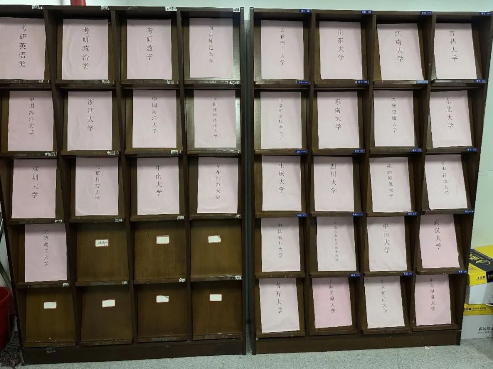 首先,让我们先来介绍一下资料室的考研资料。学院根据阅历丰富的教师们和考研学生的想法与经验,对主流的基础课辅导书、本专业及相近专业参考书进行筛选、收集,将各高校历年专业课资料复印留档,组建考研试题资料库,同时鼓励历届毕业生中已考取研究生的同学捐赠自己的考研复习资料,支持考研图书资料室的建设和发展。再由学生会的同学们对不同的学校资料做出分类整理,方便同学们及时查找。